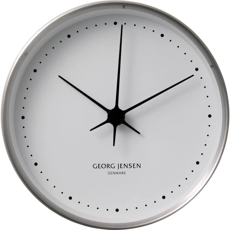 Wall clock designed by Henning Koppel for Georg Jensen. The black dots are significant for Georg Jensen’s clock collections. The clock is stylish and exudes simplicity and quality, just like the entire Georg Jensen brand.