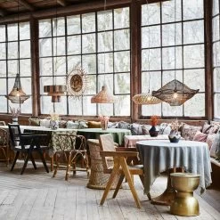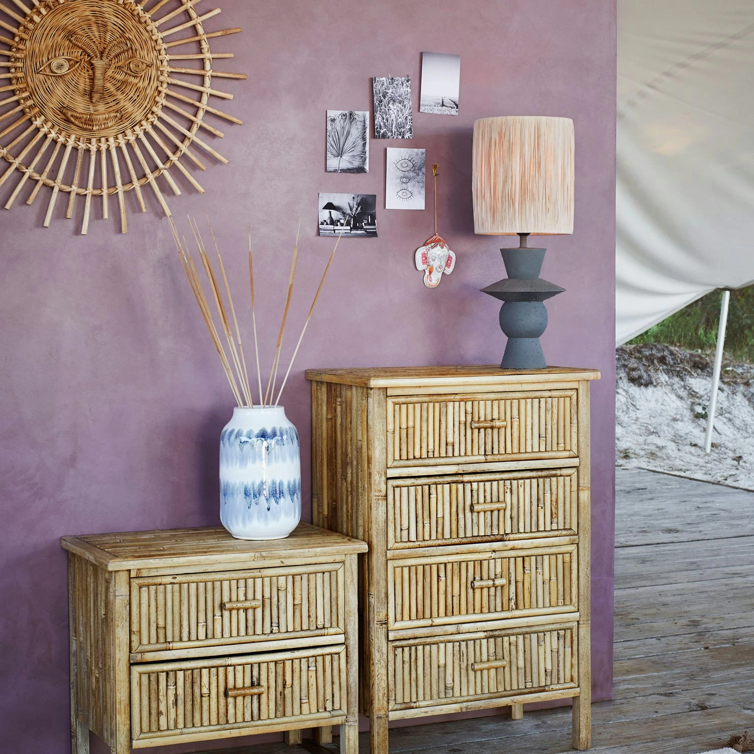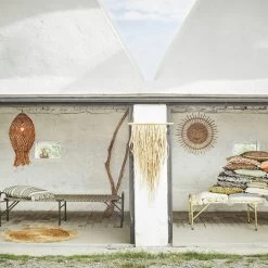 Die Wanddekoration von Madam Stoltz hat ein auffallendes Aussehen mit einem spielerischen Gesicht in der Mitte das sofort ins Auge springt. Sie hat eine runde Form mit Inspiration von der Sonne. Die Wanddekoration hat ein handgefertigtes Design aus Zuckerrohr um jedes Stück einzigartig zu machen.